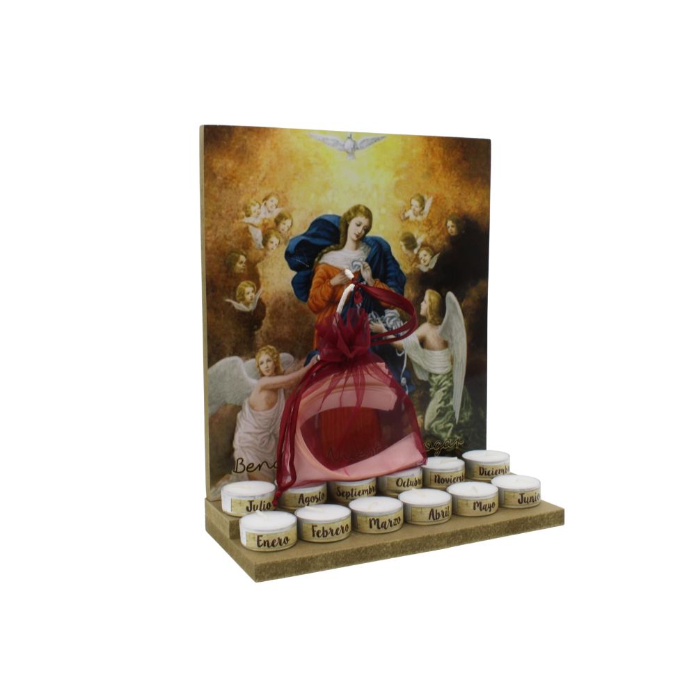 Porta velas de la Virgen María Desatadora de Nudos, un detalle de fe para acompañar la oración, ideal para colocar en el hogar o altar personal.